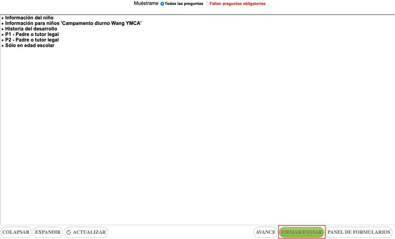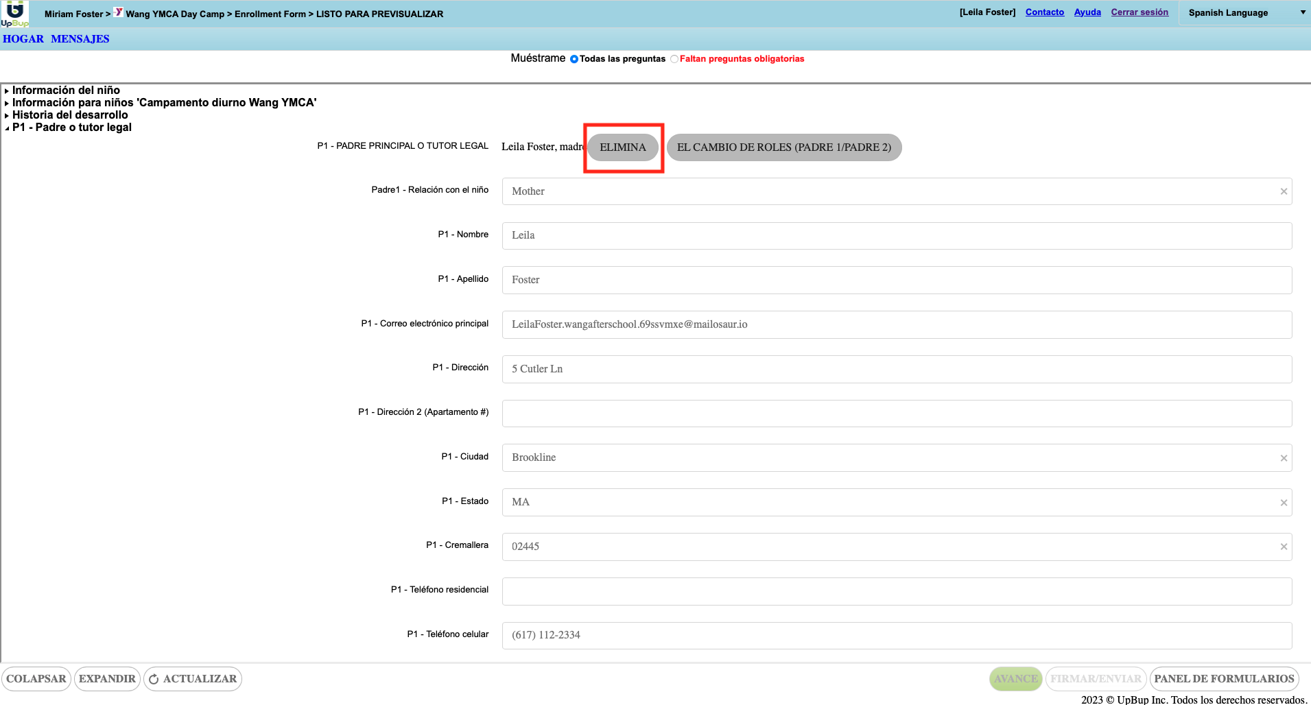 4. Puede colapsar todas las secciones de preguntas para localizar la información de contacto de P1 o P2